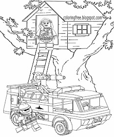 Great easy colouring worksheets for girls and boys, the big fire truck city Lego firemen people are saving the cute little girl stuck up in the beautiful garden tree-house wooden play home.